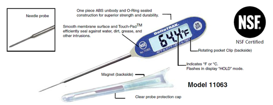 這個大屏顯示的防水溫度計是測量烹煮中和保溫中食物溫度的理想工具。根據(jù)FDA的食品法典第4-302條,溫度計構(gòu)造圖,其探針針尖設(shè)計保證其快速的反應(yīng)時間,水銀溫度計,用以測量較小塊/片的食物。 其特點包括: