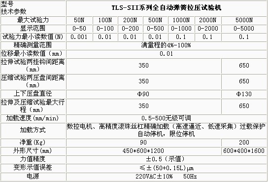 產(chǎn)品概述: TLS-SII系列全自動數(shù)顯式拉壓試驗機是適用于拉壓試驗的新型試驗設(shè)備。試驗機主機的設(shè)計具有外形美觀、操作方便、性能穩(wěn)定可靠的特點。試驗機 采用數(shù)控電機及先進的單片機控制技術(shù)加載及控制,煙臺彈簧試驗機價格,能實現(xiàn)雙速預(yù)置。實現(xiàn)了高速逼近,低速采集。提高了測試精度,保證了試驗效率。 功能特點: 自動變速檢測5個測試點,并自動返回到試驗初始位置 LED顯示,彈簧試驗負荷,人機對話直觀明了便于操作 可以選擇多種測試方法,順次自動完成一批工件的測試,可查看已測數(shù)據(jù) 傳感器引起的變形量可以補償,既傳感器和整機剛度引起的變形不影響位移精度。 可實現(xiàn)試驗力、試驗速度、位移等多種控制方式,具有以下功能: 設(shè)定變形量F,試金彈簧試驗機,檢測彈簧的試驗力P; 設(shè)定彈簧的剩余高度H,檢測彈簧的試驗力P; 彈簧變形的檢測已工作壓盤接觸彈簧為準,此時試驗力有反應(yīng),試驗力(初始力)的大小任意設(shè)定。 技術(shù)參數(shù):