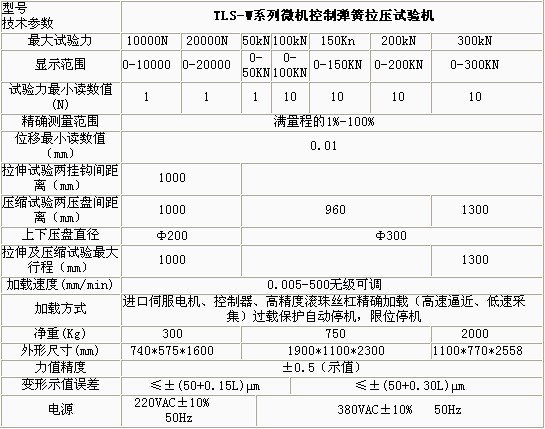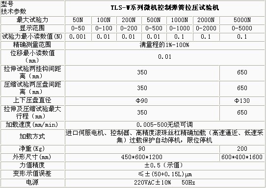 產(chǎn)品概述: TLS-WI系列微機(jī)控制拉壓彈簧試驗(yàn)機(jī)依據(jù)JB/T7796-2005《拉壓彈簧試驗(yàn)機(jī)技術(shù)條件》規(guī)定的技術(shù)要求制成。該型拉壓彈簧試驗(yàn)機(jī)主要用 于測(cè)試各種螺旋彈簧及彈性元件的強(qiáng)度,即在一定的變形量(或高度)下測(cè)試彈簧的試驗(yàn)力或在一定的試驗(yàn)力下測(cè)定彈簧的高度或變形量。 功能特點(diǎn): 本機(jī)主要適用于各種彈簧的強(qiáng)度試驗(yàn)、力學(xué)性能及工序能力分析。 本機(jī)軟件包有速度控制、參數(shù)輸入、數(shù)據(jù)處理、結(jié)果觀察、圖表顯示、圖表打印、數(shù)據(jù)保存等功能模塊組成。 試驗(yàn)方式多樣化,可以設(shè)置彈簧的試驗(yàn)力,檢測(cè)彈簧的剩余高度或變形量;也可以設(shè)置彈簧的剩余高度或變形量,檢測(cè)試驗(yàn)力等功能。 多點(diǎn)自動(dòng)變速采集數(shù)據(jù),彈簧試驗(yàn)機(jī)價(jià)格,并自動(dòng)返回到初始位置,整個(gè)試驗(yàn)過(guò)程自動(dòng)化。 過(guò)載自動(dòng)返回,以保護(hù)傳感器不受損壞。 具有強(qiáng)大的數(shù)據(jù)處理及數(shù)據(jù)統(tǒng)計(jì)功能,彈簧試驗(yàn)機(jī)廠家,繪制剛度曲線、計(jì)算彈簧的分段剛度,數(shù)顯彈簧扭轉(zhuǎn)試驗(yàn)機(jī),可以進(jìn)行數(shù)據(jù)統(tǒng)計(jì),繪制正態(tài)分布圖、計(jì)算工序能力指數(shù)。采用數(shù)控電機(jī)調(diào)速系 統(tǒng)或進(jìn)口交流伺服電機(jī)及調(diào)速器和精密滾珠絲杠副組成傳動(dòng)系統(tǒng),與高精度負(fù)荷傳感器、位移傳感器及數(shù)字式數(shù)據(jù)采集卡、PC組成測(cè)控系統(tǒng),實(shí)現(xiàn)了穩(wěn)定可靠運(yùn)行 及精確測(cè)量。 技術(shù)參數(shù): ![]() ![]()