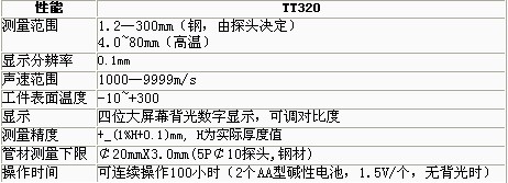 功能特點(diǎn): 1、具有高溫測試功能,測量工件表面溫度可達(dá)300度; 2、設(shè)有耦合提示、低電壓提示; 3、關(guān)機(jī)方式:手動(dòng)和自動(dòng)關(guān)機(jī)等功能(無操作三分鐘后); 4、最小值捕捉:可選擇顯示當(dāng)前厚度值或最小厚度值 5、數(shù)據(jù)存儲(chǔ):可存儲(chǔ)500個(gè)測量值和5個(gè)聲速值 6、聲速可調(diào):可利用已知厚度試塊測量聲速,數(shù)字式超聲波測厚儀,可以測試不同的高溫材料; 7、增益設(shè)置:具有高低增益設(shè)置功能 8、公英制轉(zhuǎn)換:可選擇mm或inch 9、背光顯示功能,適合在光線不好的環(huán)境中進(jìn)行測量。
