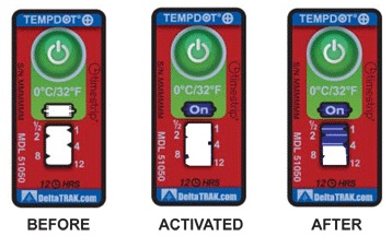 TempDot™Plus標(biāo)簽應(yīng)存儲(chǔ)在室溫下,,并必須在反應(yīng)溫度閾值以上被激活。激活是通過(guò)用手指推壓。"On"字出現(xiàn)在第一個(gè)窗口中顯示激活。之后5分 鐘內(nèi),,在反應(yīng)溫度或低于反應(yīng)溫度的情況下將標(biāo)簽貼到產(chǎn)品上。藍(lán)色染料熔化并以控制的速率遷移,,經(jīng)過(guò)白色大窗口。這表示暴露在溫度閾值以上的累計(jì)時(shí)間。當(dāng)溫 度低于閾值時(shí),該染料固化并停止移動(dòng)。如果溫度超過(guò)閾值,TempDot®Plus標(biāo)簽提供即時(shí)的視覺跡象。