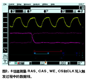 如圖2所示16條邏輯定時信道用來設(shè)置在RAS高、CAS低、WE高和CS上觸發(fā)系統(tǒng)。示波器信道1用來察看和抽換法時鐘的上升沿。在邏輯分析儀和示波器組合解決方案中邏輯分析儀只能交叉觸發(fā)示波器或反之與此不同混合信號示波器可以在示波器和邏輯定時信道中進行全寬觸發(fā)。