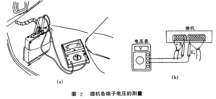 (4)必須在微機和線束連接器(插頭)處于連接的狀態(tài)下測量微機各端子的電壓并且萬用表的測筆應從線束插頭的導線一側(cè)插入進行測量微機各端子的電壓(如圖 2所示)。
