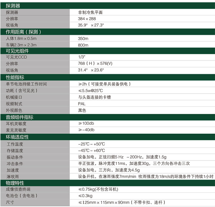 產(chǎn)品特點 多傳感器集成 集可見光、紅外、音頻于一體,紅外熱像儀測溫技術(shù),能在夜間及惡劣氣象條件下輔助單兵進行偵察